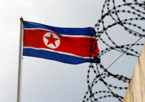 The North Korea flag flutters next to concertina wire at the North