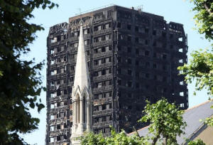 A church spire stands in the foreground of Grenfell Tower in North Kensington, London, Britain, June 19, 2017. REUTERS/Marko Djurica |