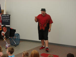 The Summer Reading Program also has a second fun aspect and that is the Thursday morning entertainment in the Annex. This summer Jonathon May from Des Moines, Iowa led off the summer entertainment with a fast paced show of magic and humor. Lincoln was one of many stops he had planned for the day in central Illinois. A man who does over 400 shows a year and intends to hit 50 cities in Iowa, Illinois, and South Dakota in six weeks really has to move along. He has been a successful entertainer for most of his life, but has been doing it full time for six years. He brings his exciting shows to a mix of kids and adults, crafting each show to his unique audience.