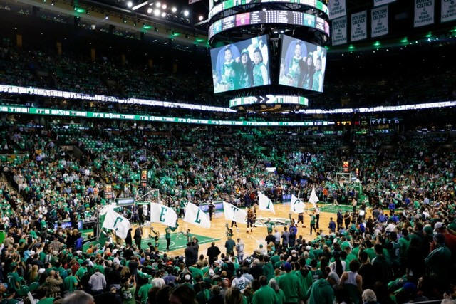 The Boston Celtics dance team waves flags before the start of game