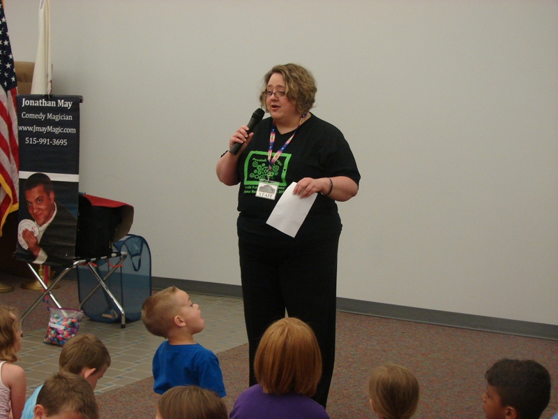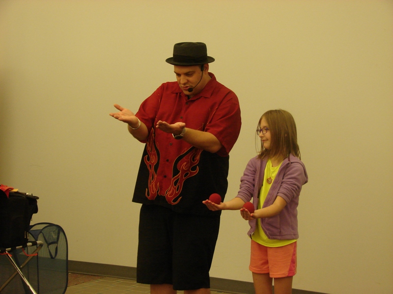 The Summer Reading Program also has a second fun aspect and that is the Thursday morning entertainment in the Annex. This summer Jonathon May from Des Moines, Iowa led off the summer entertainment with a fast paced show of magic and humor. Lincoln was one of many stops he had planned for the day in central Illinois. A man who does over 400 shows a year and intends to hit 50 cities in Iowa, Illinois, and South Dakota in six weeks really has to move along. He has been a successful entertainer for most of his life, but has been doing it full time for six years. He brings his exciting shows to a mix of kids and adults, crafting each show to his unique audience.