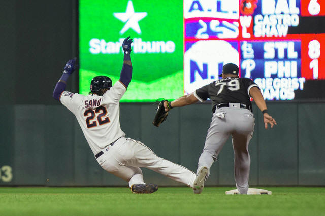 Twins designated hitter Miguel Sano (22) slides back to second