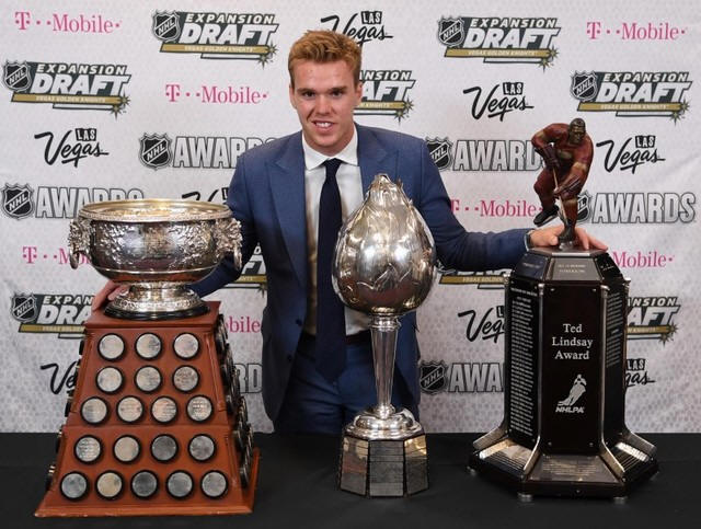Edmonton Oilers forward Connor McDavid poses for a photo with