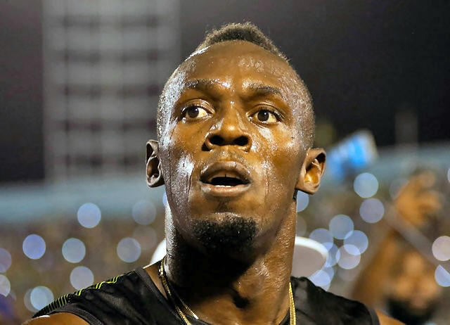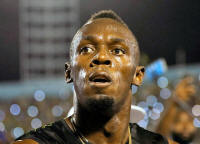 Jamaica's Olympic champion Usain Bolt looks up after winning his