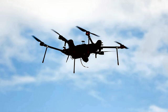 An Airspace Systems Interceptor autonomous aerial drone flies during