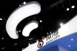 Sina Weibo's booth is pictured at the Global Mobile Internet