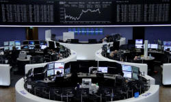 Traders work in front of the German share price index, DAX board, at