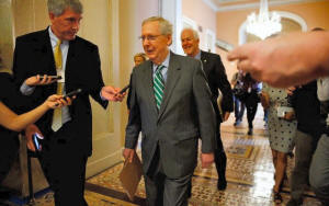 Senator Majority Leader Mitch McConnell is trailed by reporters as