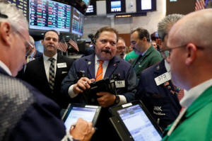 Traders work on the floor of the New York Stock Exchange shortly