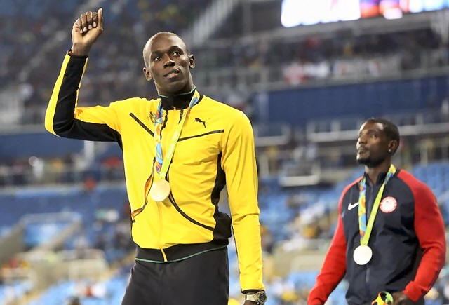 Gold medalist Usain Bolt (JAM) of Jamaica and silver medalist Justin