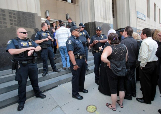 Family members of detainees line up to enter the federal court just
