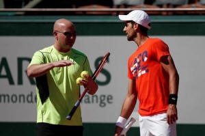 Novak Djokovic of Serbia and his coach Andre Agassi attend a