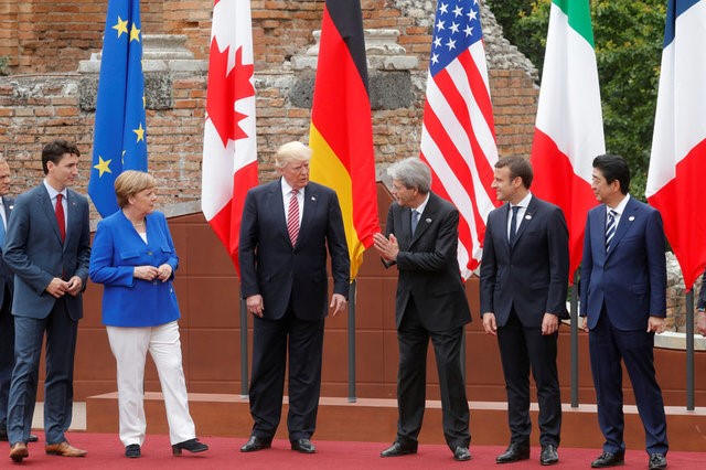 react during a family photo during the G7 Summit in Taormina,