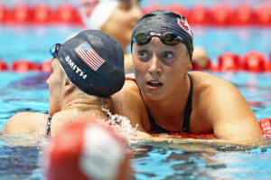 Leah Smith hugs Katie Ledecky (right) after the women's 800m