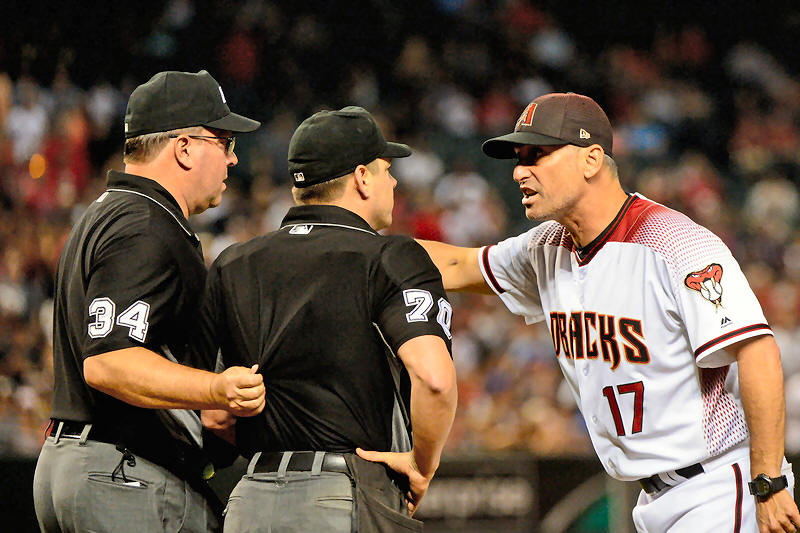 manager Torey Lovullo (17) argues with MLB umpires D.J.