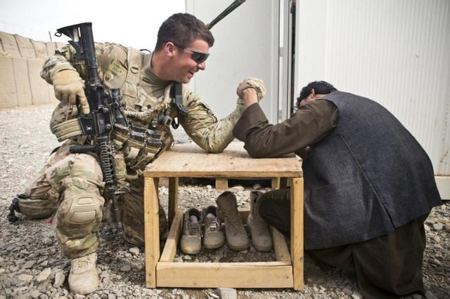 wrestle prior to a joint patrol near Command Outpost AJK (short for