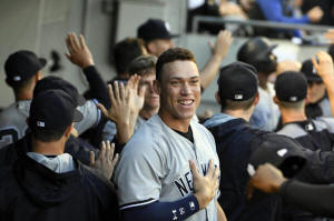 Yankees right fielder Aaron Judge (99) smiles after the Yankees