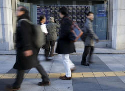 passers-by walk past, outside a brokerage in Tokyo, Japan January