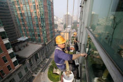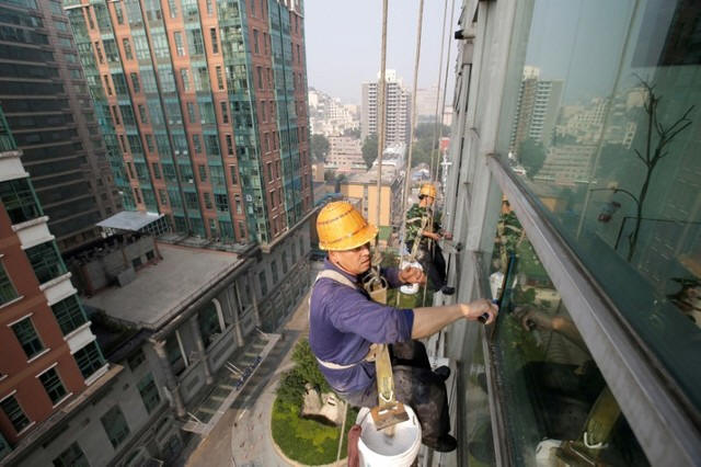 Workers clean the windows of an apartment block in Beijing, China,