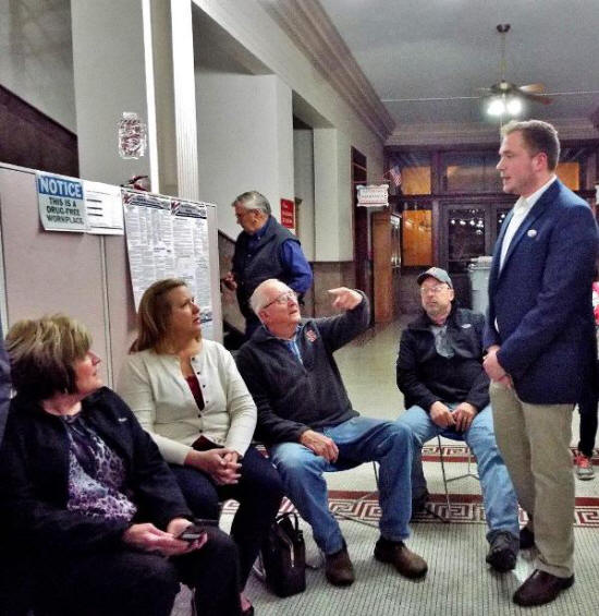 On Tuesday evening the Logan County Courthouse rotunda filled as candidates and their supporters came to watch for results to be posted. In the hotly contested Lincoln mayoral race, Seth Goodman (standing right) won the Republican Primary. Two Lincoln alderman positions were also contested with Kathy Horn keeping her Ward 2 seat, and Ron Keller winning Ward 3.