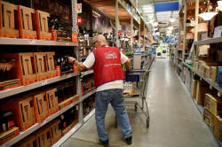 An employee restocks items at a Lowe's home improvement chain in
