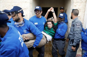 Israeli policemen remove a pro-settlement activist during an
