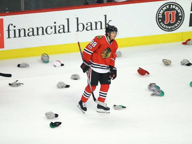 Blackhawks right wing Patrick Kane (88) after tallying a hat trick