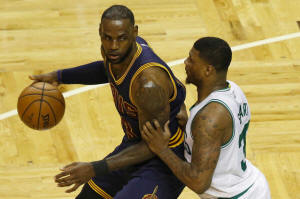 forward LeBron James (23) is guarded by Boston Celtics point guard