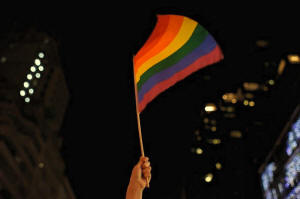 An activist waves a rainbow flag during the "Queer and Trans Dance