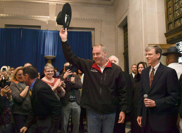 New Interior Secretary Ryan Zinke tips his cowboy hat after riding