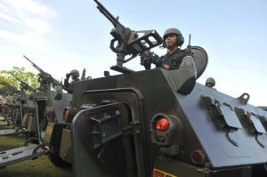 Indonesian soldiers are seen on armoured personnel carriers during a
