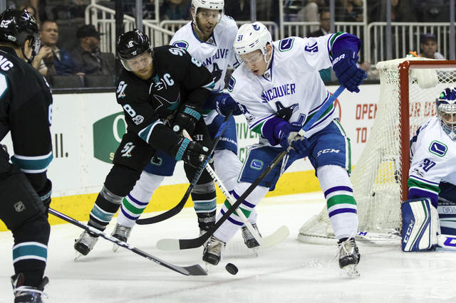 Sharks center Joe Pavelski (8) and Vancouver Canucks defenseman Troy