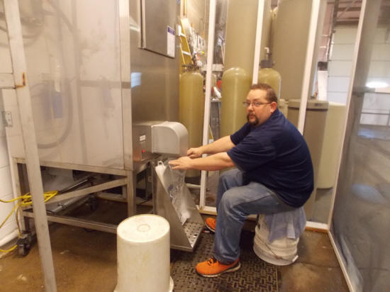 Jeremy Letterle bags up ice from one of the new machines recently installed at Culligan Water in Lincoln. Culligan recently wrapped up a remodeling project at the facility at 318 N. Chicago Street, which included rearranging their space to accommodate the larger ice and bagging equipment so as to better serve local customers.