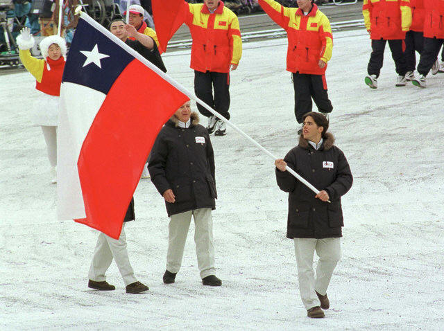 Chilean alpine skier Thomas Grib carries his country's flag as he
