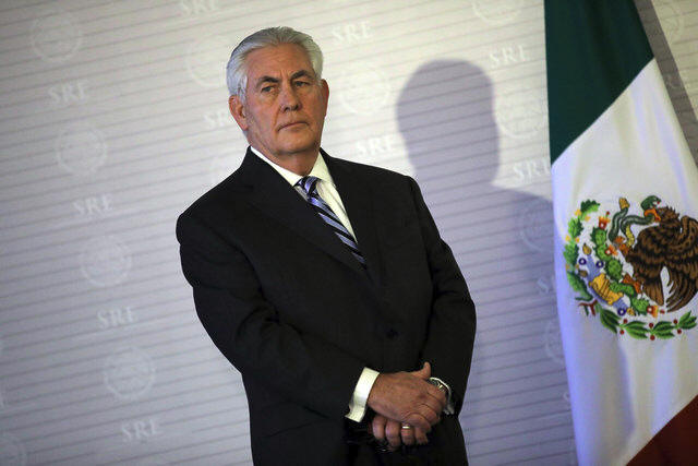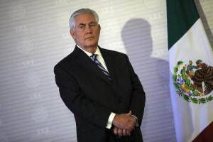 U.S. Secretary of State Rex Tillerson stands next to a Mexican flag