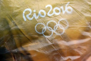 Rain falls on a canvas bearing the 2016 Rio Olympics logo.