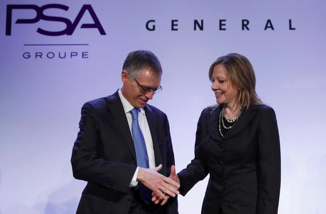 carmaker PSA Peugeot Citroen, shakes hands with Mary Barra,