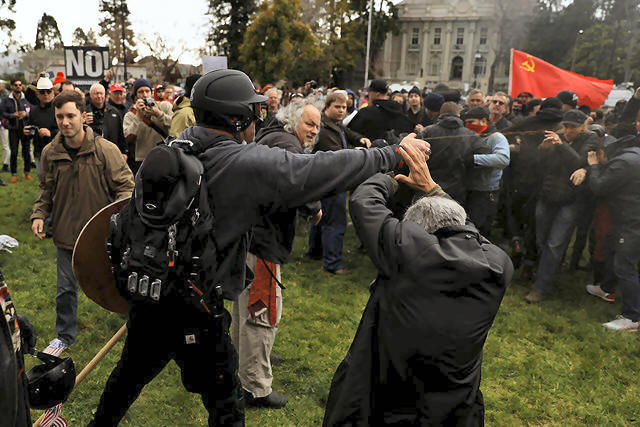 black-clad opponents. An elderly Trump supporter was struck in the head