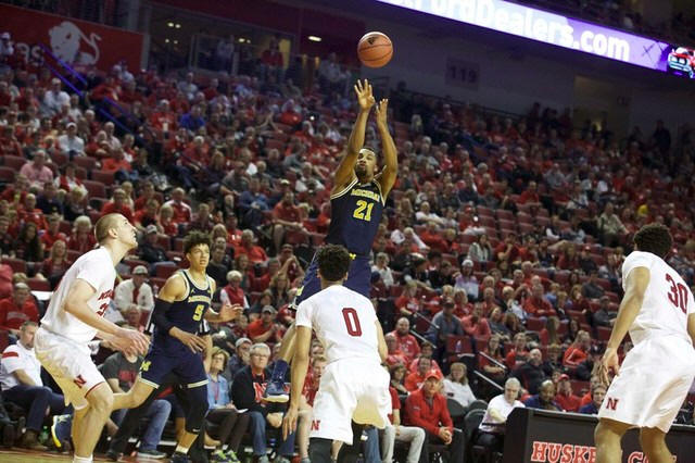 Michigan Wolverines guard Zak Irvin (21) shoots over Nebraska