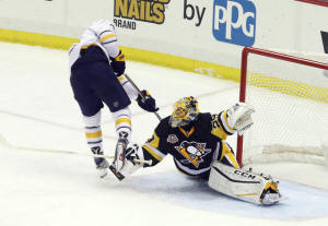 Penguins goalie Marc-Andre Fleury (29) makes a save against Buffalo