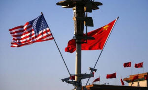 U.S. (L) and Chinese national flags flutter on a light post at the