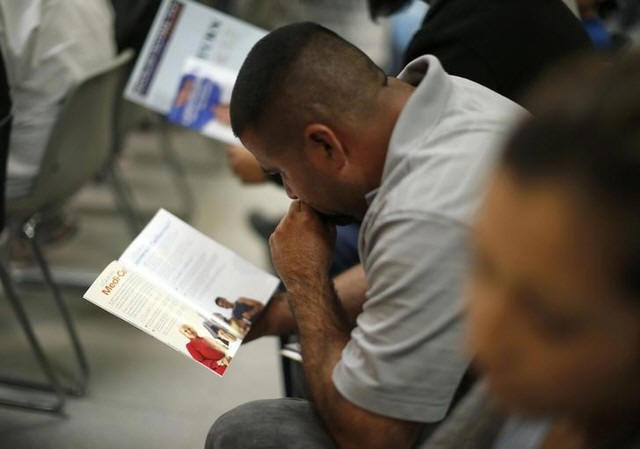People read pamphlets as they wait in line at a health insurance
