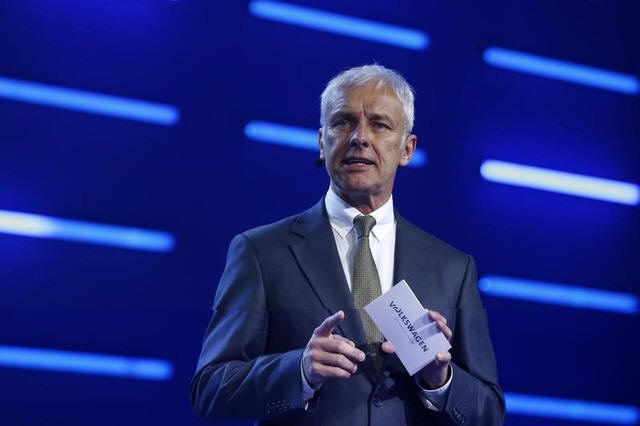 Volkswagen CEO Matthias Mueller speaks during Volkswagen event ahead