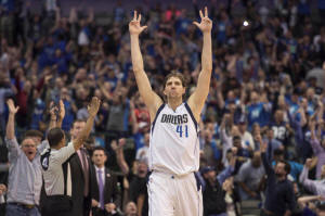 Dallas Mavericks forward Dirk Nowitzki (41) celebrates after making