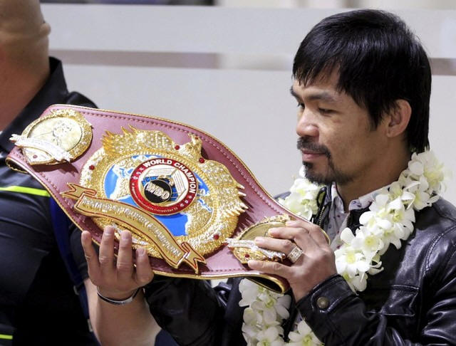 Filipino boxing champion Manny Pacquiao looks at his WBO