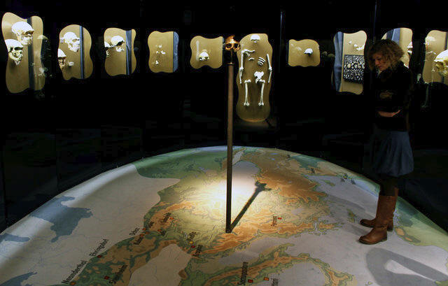 A girl looks the replica of a neanderthal skull displayed in the new