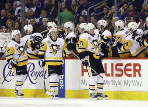 Penguins center Evgeni Malkin (71) celebrates his goal with