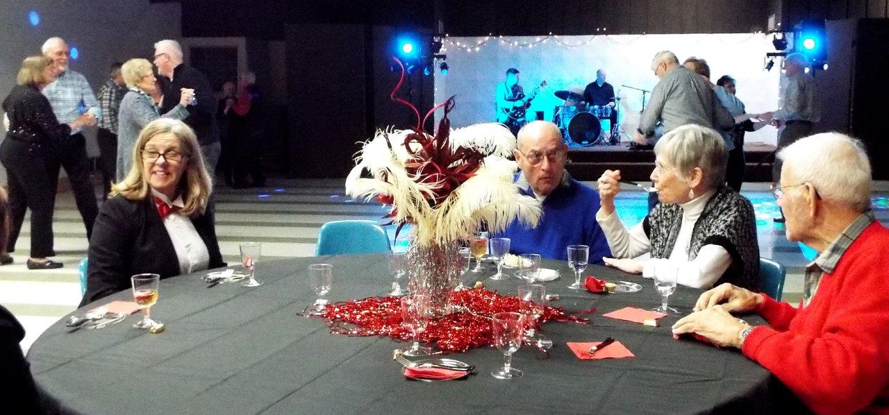 d'oeuvres table, and friends snacked and visited at decorated tables