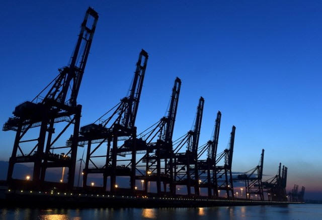 Loading cranes are seen at a shipping terminal at the harbour in