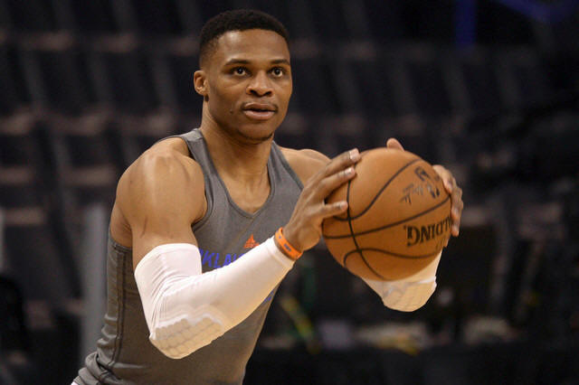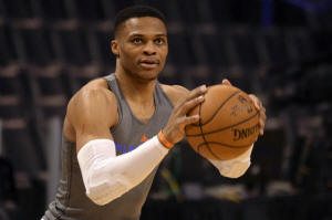 Thunder guard Russell Westbrook (0) warms up prior to action against